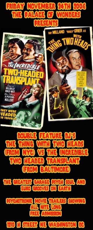 Dig this, daddy... The Thing With Two Heads (DJ's Bazooka Joe & XTINE16) from NYC spinning with The Two Headed Transplant (DJ's Amanda Otto & Bump) from Baltimore in our nation's capitol the day after Thanksgiving! This is a gonna be a triptophane work-it-out, so eat your fill on Thursday and come dance it off on Friday!